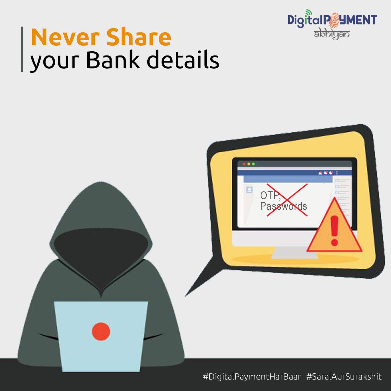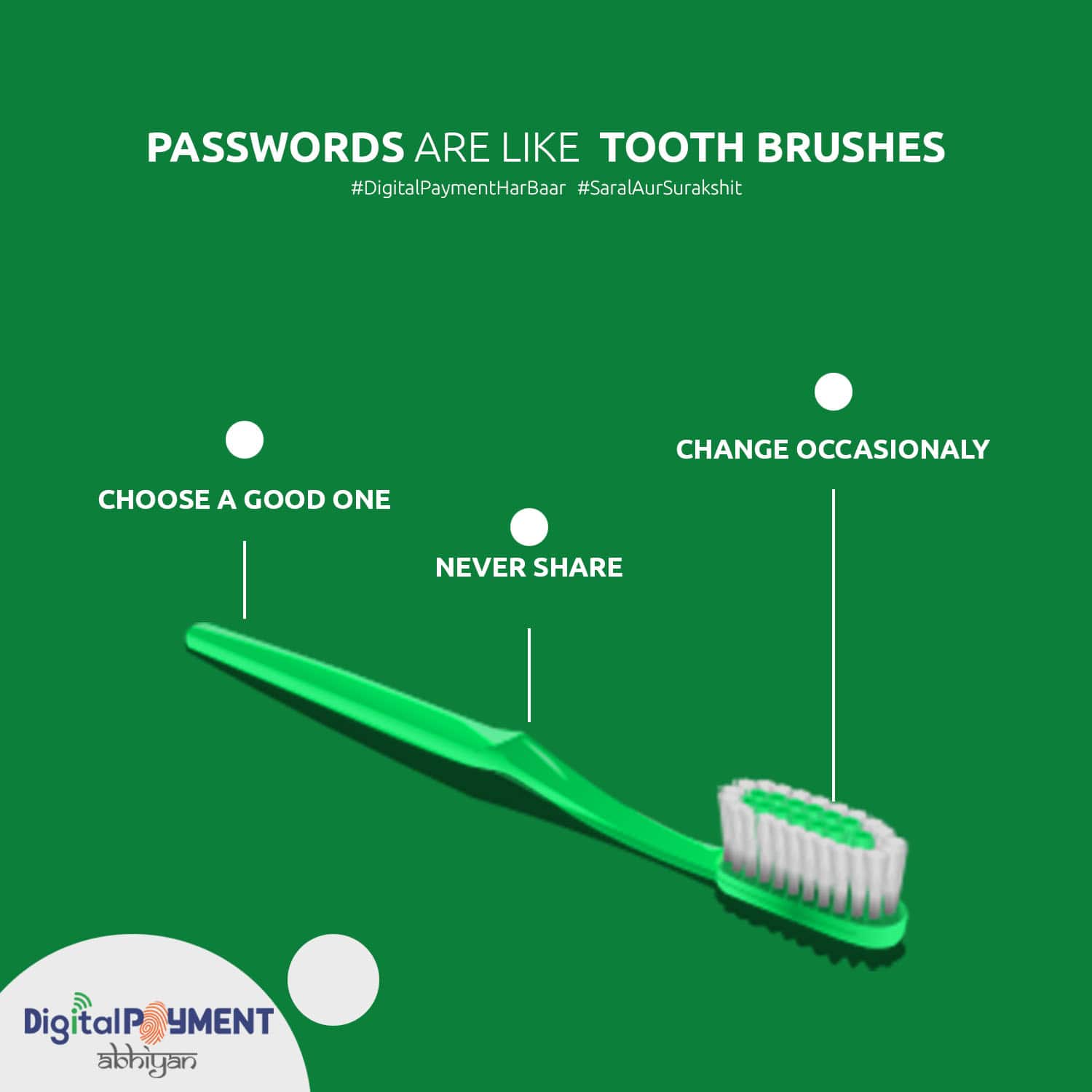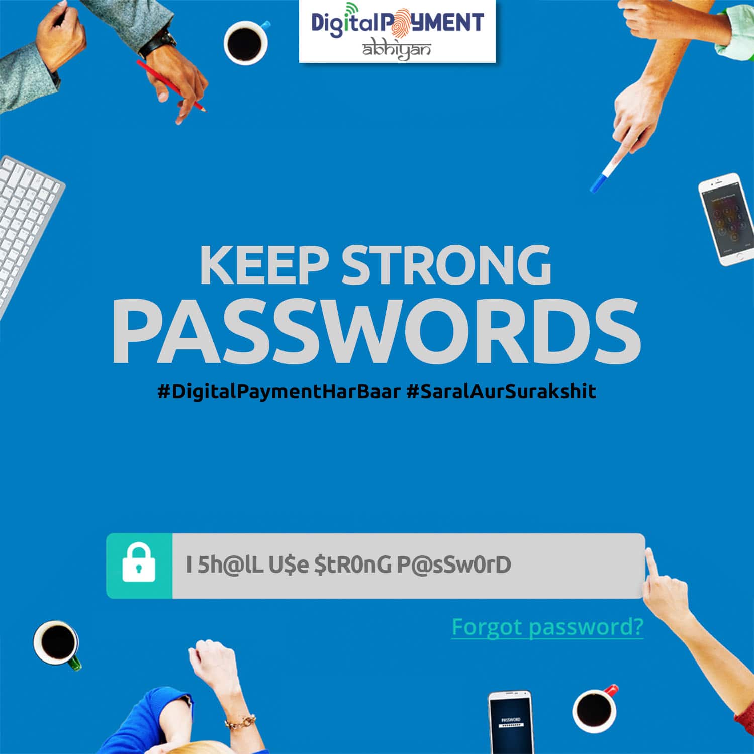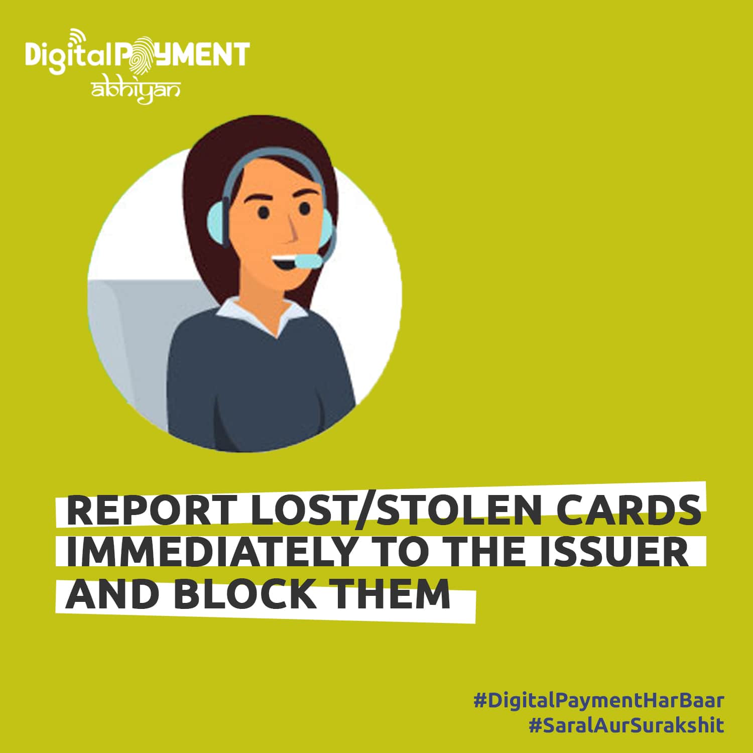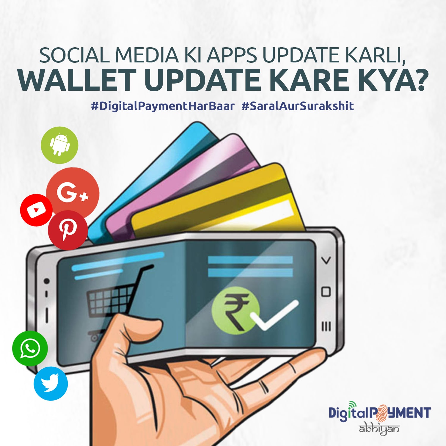 Digital Payment Abhiyan is a multilingual pan India campaign in Hindi, English, Tamil, Telugu, Bengali, Kannada and Marathi attempting to engage with communities from Tier – II & III cities as well as urban population to spread awareness over digital payment benefits and its security aspects. Various payments channels such as UPI, Credit & Debit Card, Digital Wallet and Online & Mobile Banking have been chosen as the mediums to spread awareness. Over the year, several digital content artefacts like awareness films, posters, brochures will be developed and disseminated over digital broadcast mediums. In order to truly transform India into a cashless society, we believe Digital Payments should be imbibed like a habit - #DigitalPaymentHarBaar as they are #SaralAurSurakshit.
